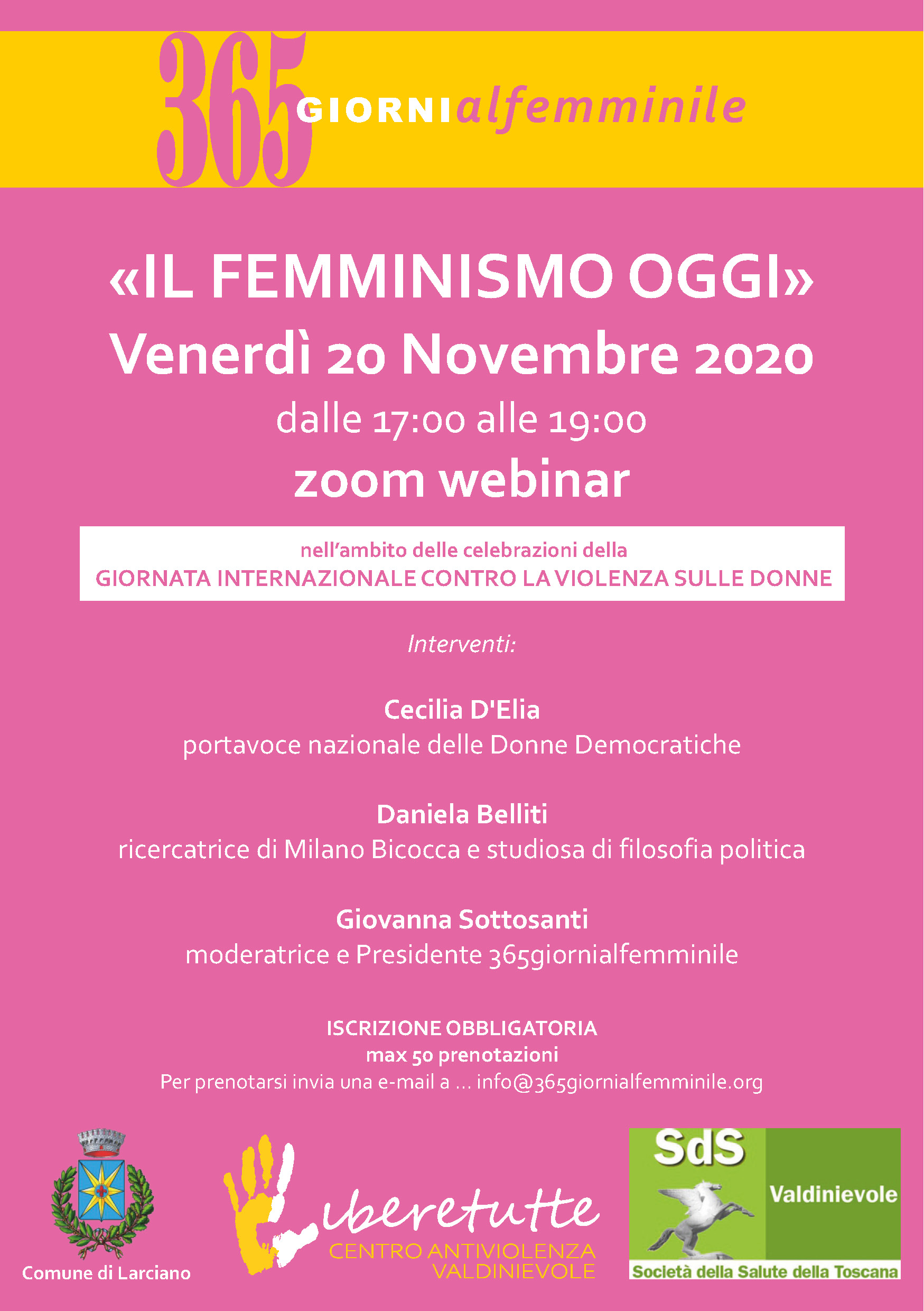 Venerdì 20 Novembre 2020 dalle 17:00 alle 19:00 zoom webinar nell'ambito delle celebrazioni della GIORNATA INTERNAZIONALE CONTRO LA VIOLENZA SULLE DONNE Interventi: Cecilia D'Elia portavoce nazionale delle Donne Democratiche Daniela Belliti ricercatrice di Milano Bicocca e studiosa di filosofia politica Giovanna Sottosanti moderatrice e Presidente 365giornialfemminile