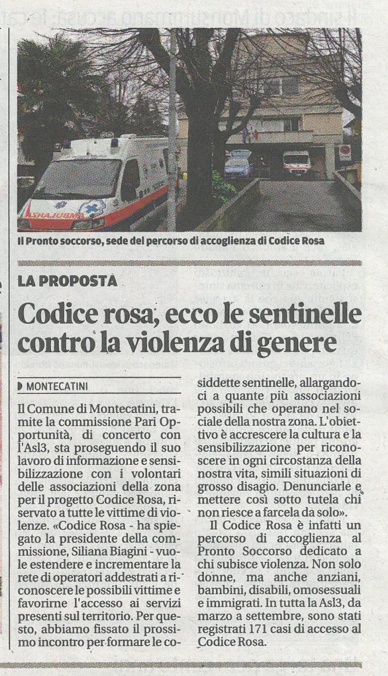 MONTECATINI – Il Comune di Montecatini, tramite la commissione Pari Opportunità, di concerto con l’Asl3, sta proseguendo il suo lavoro di informazione e sensibilizzazione con i volontari delle associazioni della zona per il progetto Codice Rosa, riservato a tutte le vittime di violenze. «Codice Rosa – ha spiegato la presidente della commissione, Siliana Biagini – vuole estendere e incrementare la rete di operatori addestrati a riconoscere le possibili vittime e favorirne l’accesso ai servizi presenti sul territorio. Per questo, abbiamo fissato il prossimo incontro per formare le cosiddette sentinelle, allargandoci a quante più associazioni possibili che operano nel sociale della nostra zona. L’obiettivo è accrescere la cultura e la sensibilizzazione per riconoscere in ogni circostanza della nostra vita, simili situazioni di grosso disagio. Denunciarle e mettere così sotto tutela chi non riesce a farcela da solo».