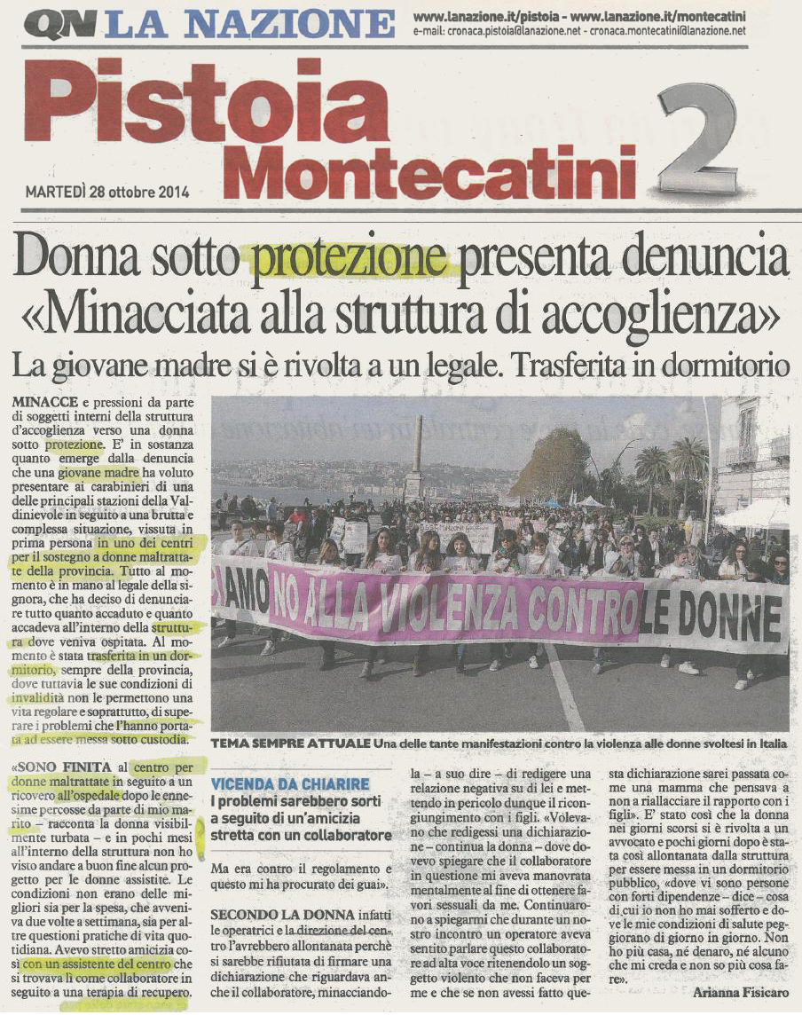 SECONDO LA DONNA infatti le operatrici e la direzione del Centro l’avrebbero allontanata perchè si sarebbe rifiutata di firmare una dichiarazione che riguardava anche il collaboratore, minacciandola – a suo dire – di redigere una relazione negativa su di lei e mettendo in pericolo dunque il ricongiungimento con i figli. «Volevano che redigessi una dichiarazione – continua la donna – dove dovevo spiegare che il collaboratore in questione mi aveva manovrata mentalmente al fine di ottenere favori sessuali da me. Continuarono a spiegarmi che durante un nostro incontro un operatore aveva sentito parlare questo collaboratore ad alta voce ritenendolo un soggetto violento che non faceva per me e che se non avessi fatto questa dichiarazione sarei passata come una mamma che pensava a non a riallacciare il rapporto con i figli». E’ stato così che la donna nei giorni scorsi si è rivolta a un avvocato e pochi giorni dopo è stata così allontanata dalla struttura per essere messa in un dormitorio pubblico, «dove vi sono persone con forti dipendenze – dice – cosa di cui io non ho mai sofferto e dove le mie condizioni di salute peggiorano di giorno in giorno. Non ho più casa, né denaro, né alcuno che mi creda e non so più cosa fare».