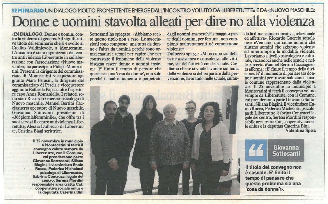 I relatori sono stati Riccardo Guercio psicologo di Nuovo maschile, Manuel Bertini Cacciagliene operatore di Nuovo maschile, Giovanna Sottosanti presidente di «365giornialfemminile», che offre tra i suoi servizi il centro antiviolenza Liberetutte, Alessia Dulbecco di Liberetutte, Cristina Biagi scrittrice.