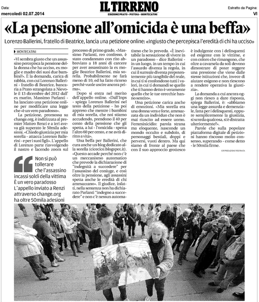 «Vi sembra giusto che un assassino percepisca la pensione della donna che ha ucciso, ex moglie e madre dei suoi due bambini?”, E’ la domanda, carica di rabbia, con cui Lorenzo Ballerini – fratello di Beatrice, bancaria a Prato strangolata a Nievole il 13 dicembre del 2012 dall’ex marito. Massimo Parlanti – ha lanciato una petizione online per modificare una legge che «è un vero paradosso».