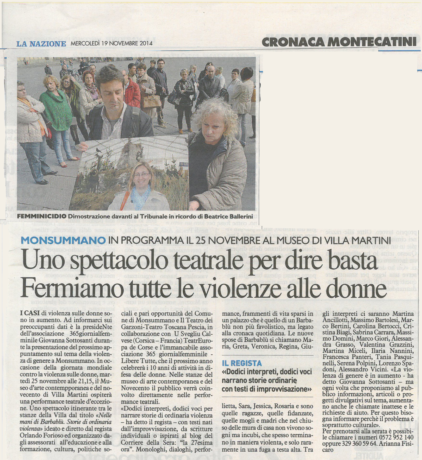 I CASI di violenza sulle donne sono in aumento. Ad informarci sui preoccupanti dati è la presidente dell’associazione 365giornialfemminile Giovanna Sottosanti durante la presentazione del prossimo appuntamento sul tema della violenza di genere a Monsummano. In occasione della giornata mondiale contro la violenza sulle donne, martedì 25 novembre alle 21.15, il Museo d’arte contempporanea e del novecento di Villa Martini ospiterà una performance teatrale d’eccezione. Uno spettacolo itinerante tra le stanze della Villa dal titolo «Nelle mani di Barbablù. Storie di ordinaria violenza» ideato e diretto dal regista Orlando Forioso ed organizzato dagli assessorati all’educazione e alla formazione, cultura, politiche sociali e pari opportunità del Comune di Monsummano e II Teatro dei Garzoni-Teatro Toscana Pescia, in collaborazione con U Svegliu Calvese (Corsica – Francia) TeatrEuropa de Corse e l’immancabile associazione 365giornialfemminile – LibereTutte, che il prossimo anno celebrerà i 10 anni di attività in difesa delle donne. Nelle stanze del museo di arte contemporanea e del Novecento il pubblico verrà coinvolto direttamente nelle performance teatrali.