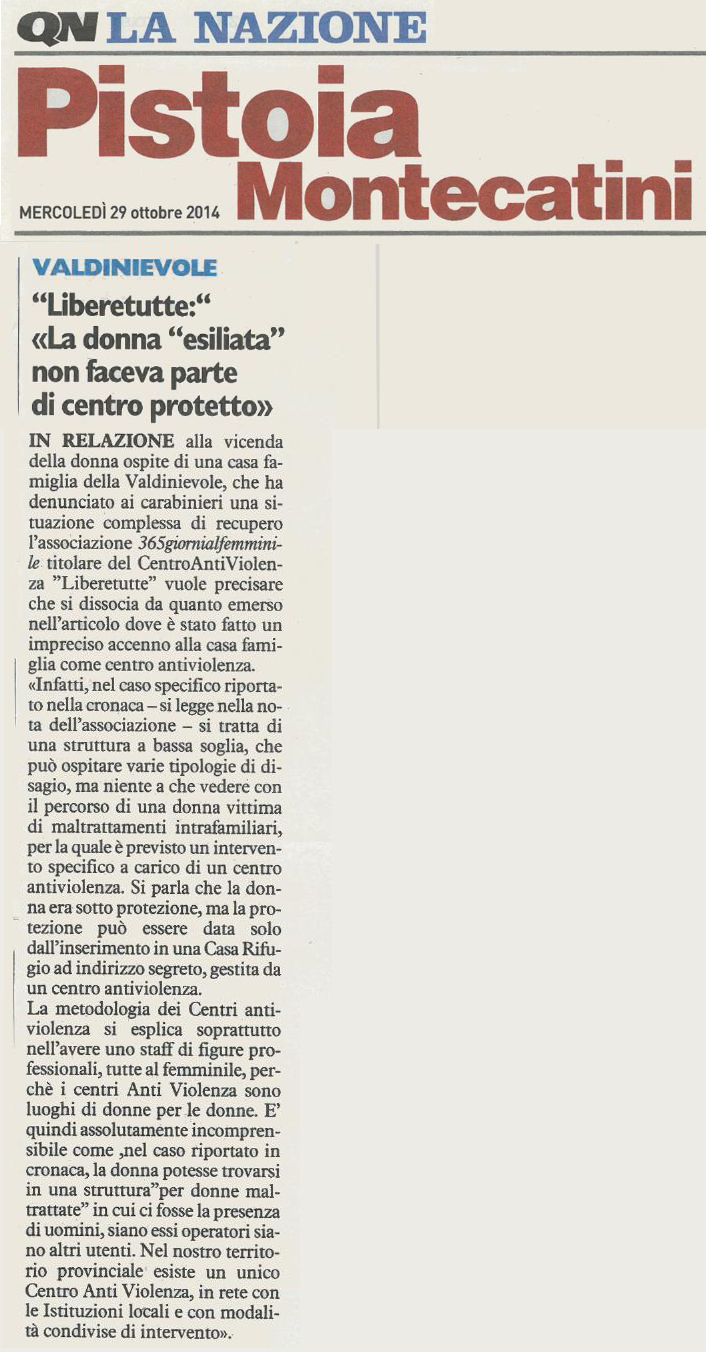 IN RELAZIONE alla vicenda della donna ospite di una casa famiglia della Valdinievole, che ha denunciato ai carabinieri una situazione complessa di recupero l'associazione 365gwrnialfemminile titolare del CentroAntiViolenza "Liberetutte" vuole precisare che si dissocia da quanto emerso nell'articolo dove è
